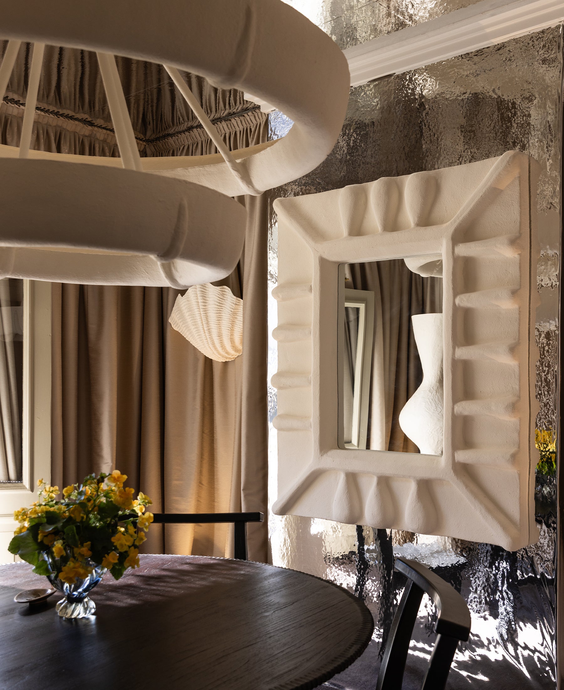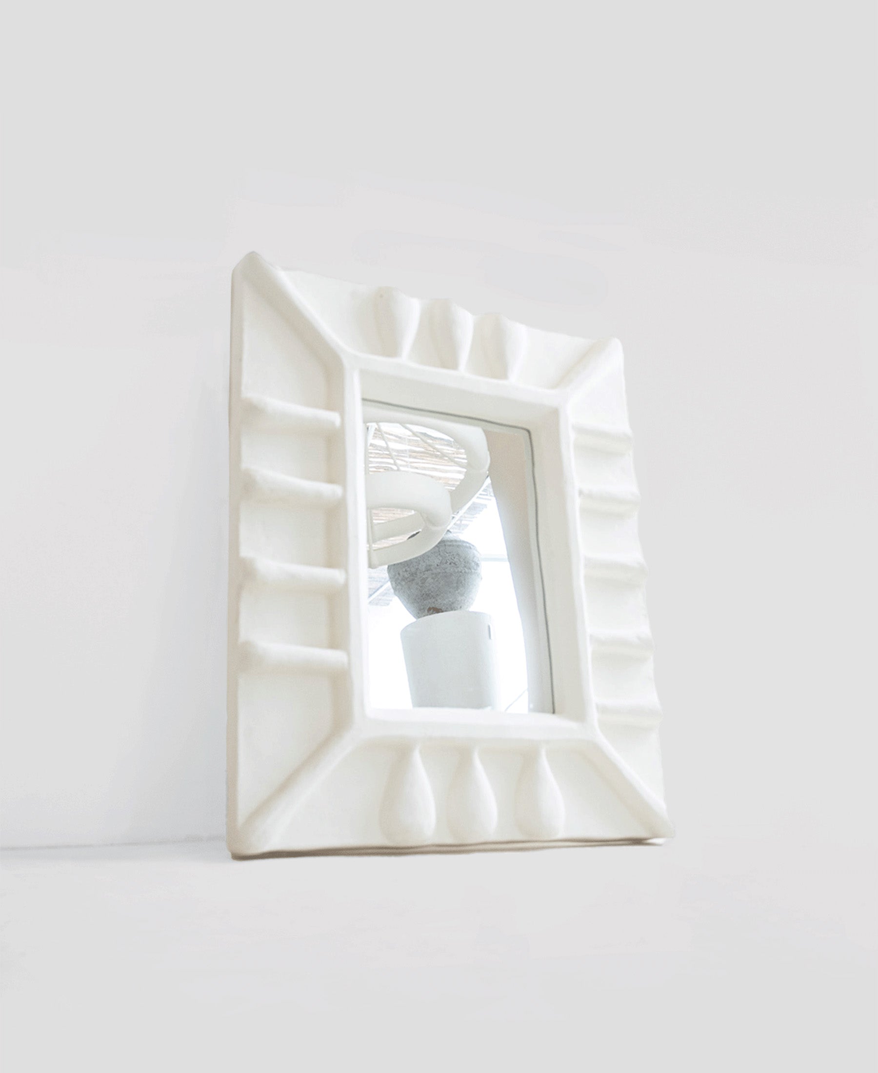 Shaped by hand, each maker sculpts artful details into existence, leaving unique markings in every groove and brushstroke. A mirror intended to artfully reflect and refract, adding dimension and illumination to the space.