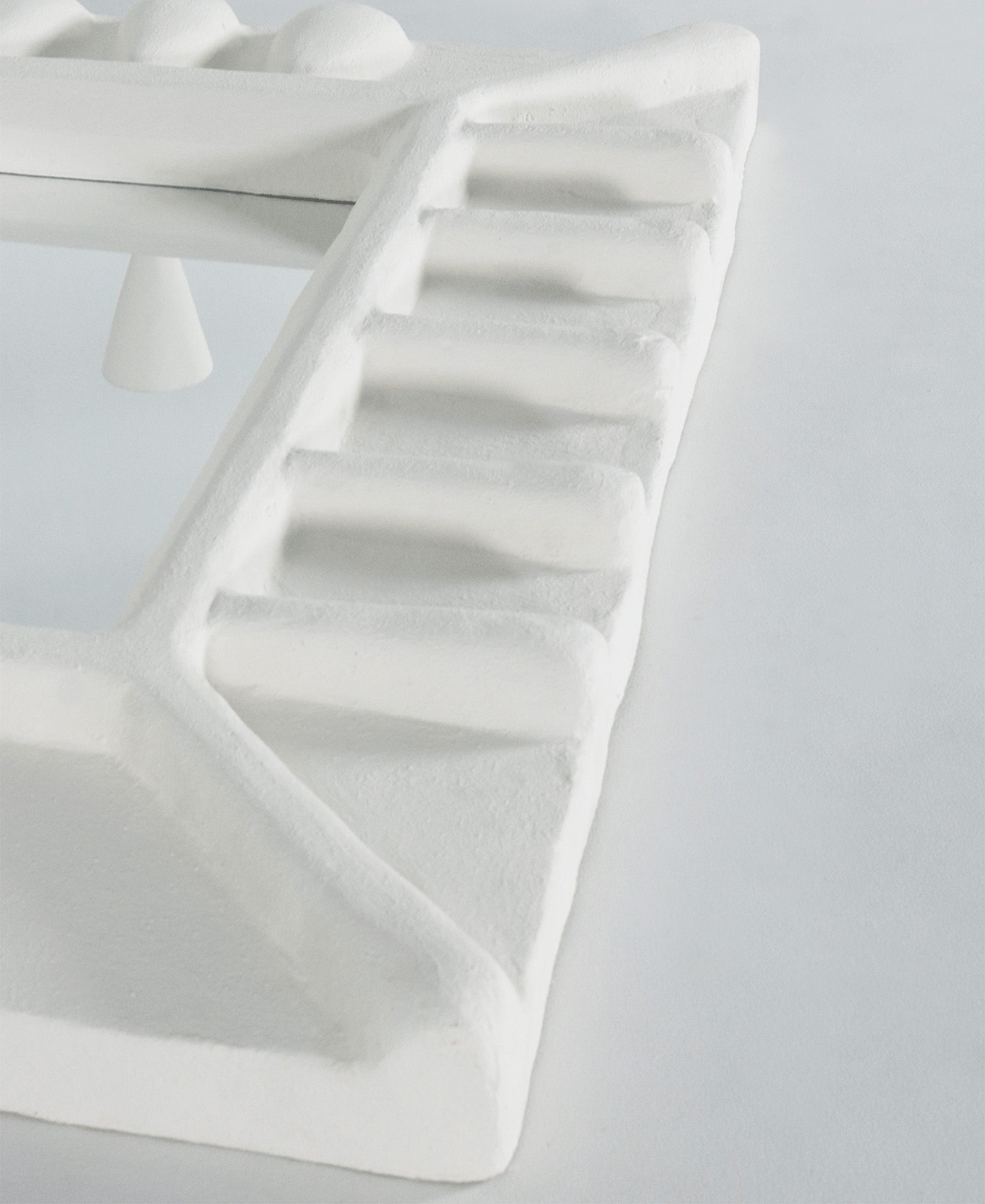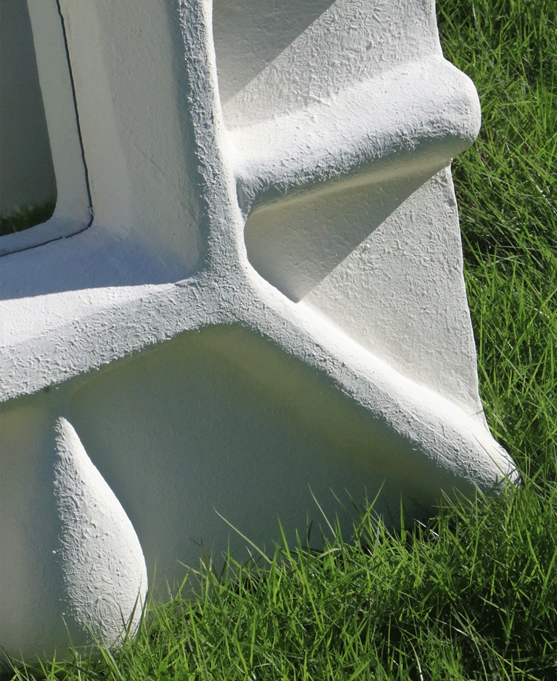 The resin mould, which casts a bold and momentous form, is layered with a polymer plaster finish. Applied with irregular brushstrokes, the off-white finish is visible on all exposed sides. After each coat, the plaster is cured by fan-drying, repeated up to three times to achieve the desired depth and strengthen the surface finish.