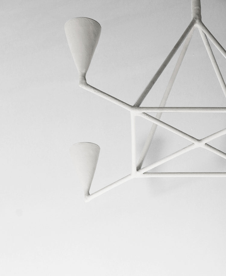 The finished piece is asymmetrical and slightly abstract, fusing with a minimalist off-white colouring – the result of up to four coats of a polymer plaster finish, massaged by hand for added texture.
