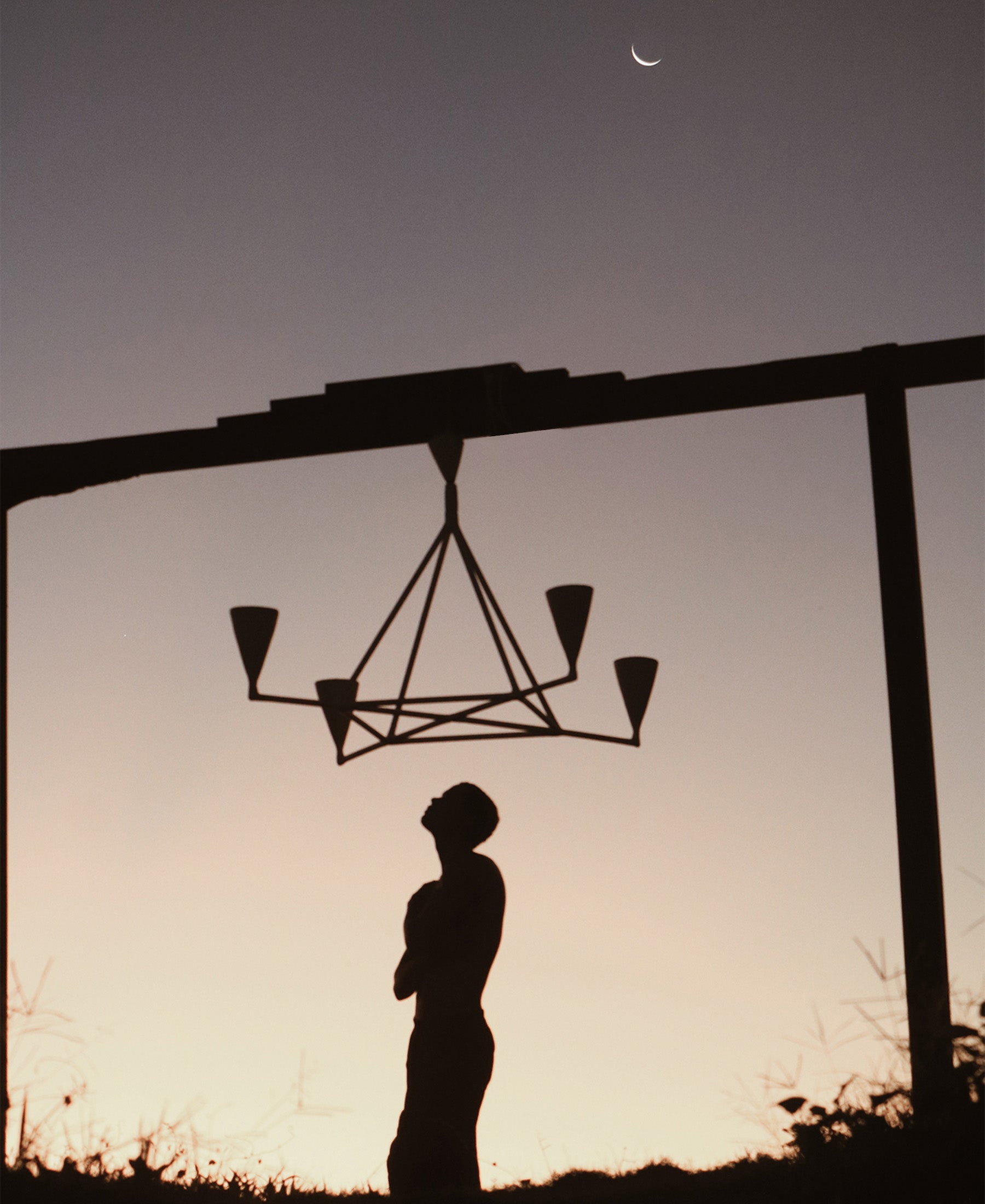 A hanging light of maximum proportion, pointing to the meeting place where the stories unfold. With a hand-sculpted surface, crafted from a resin mould, adding new depth and dimension to each space.