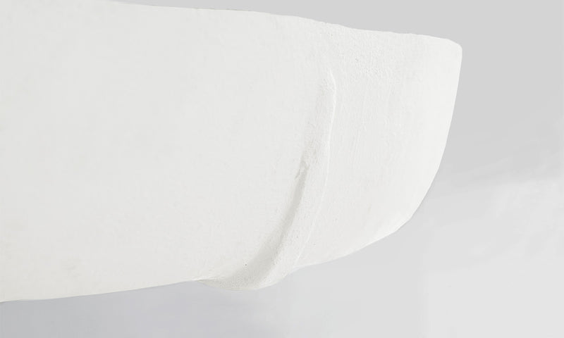 Hand-sculpted and finished, the hanging light is crafted from a resin mould. The finished piece is asymmetrical and slightly rugged, fusing with a minimalist off-white colouring – the result of up to four coats of a polymer plaster finish, massaged by hand for added texture.