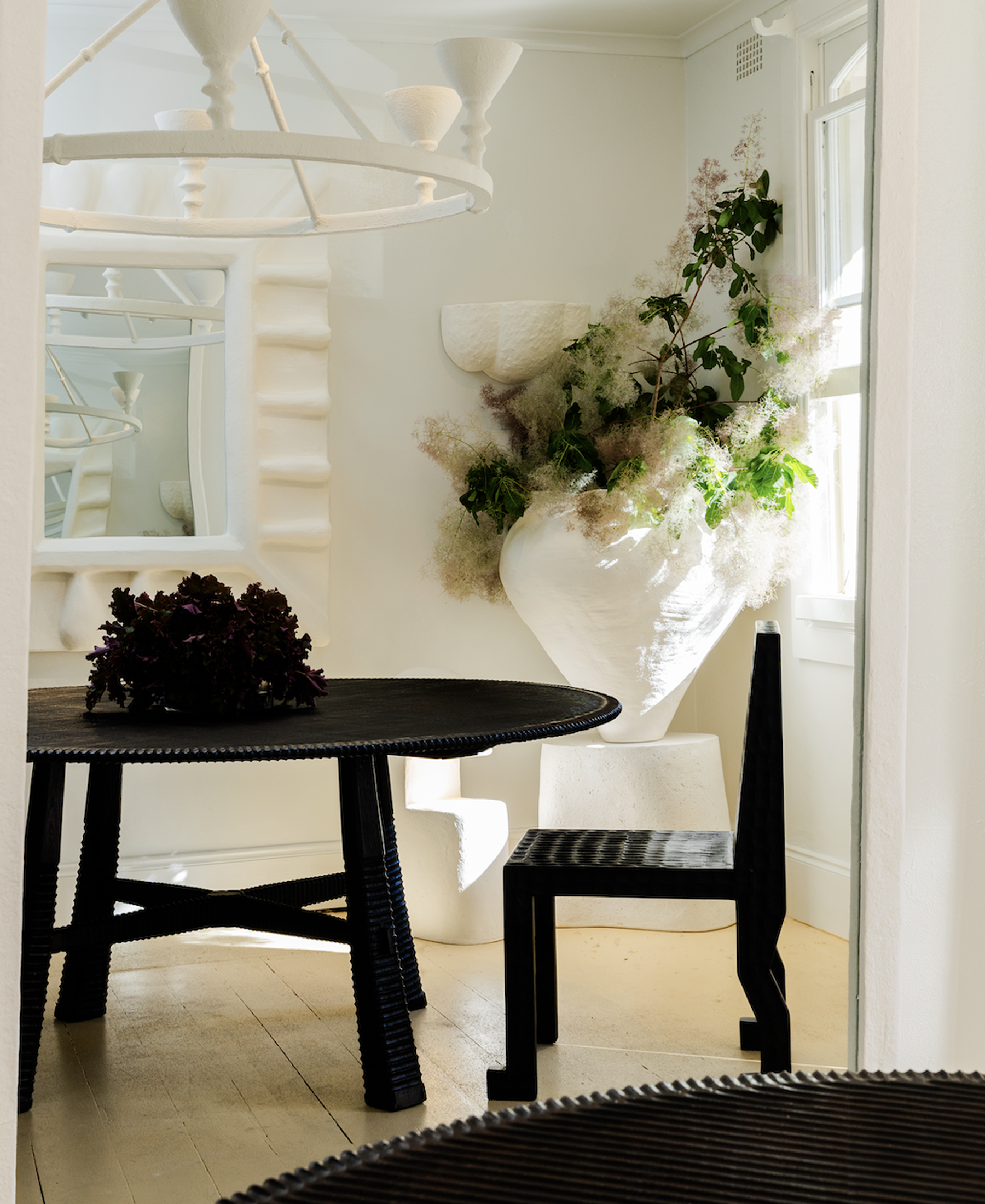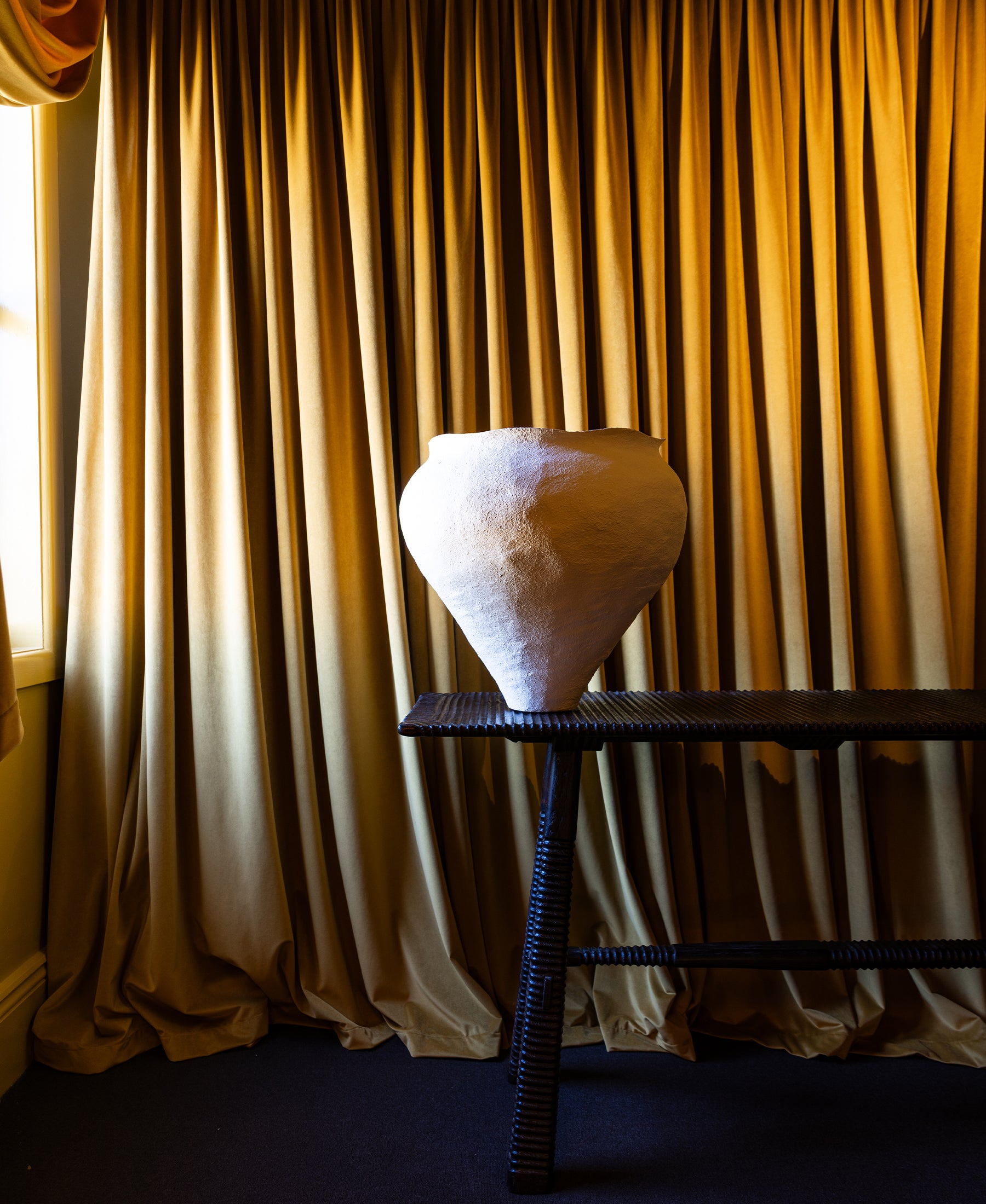 Using a resin mould, a concrete base is added to the piece for weight and stability. To achieve the off-white colouring, a polymer plaster finish is hand-brushed onto the mould – up to three coats of plaster for each piece, resulting in the multi-layered, inviting finish.