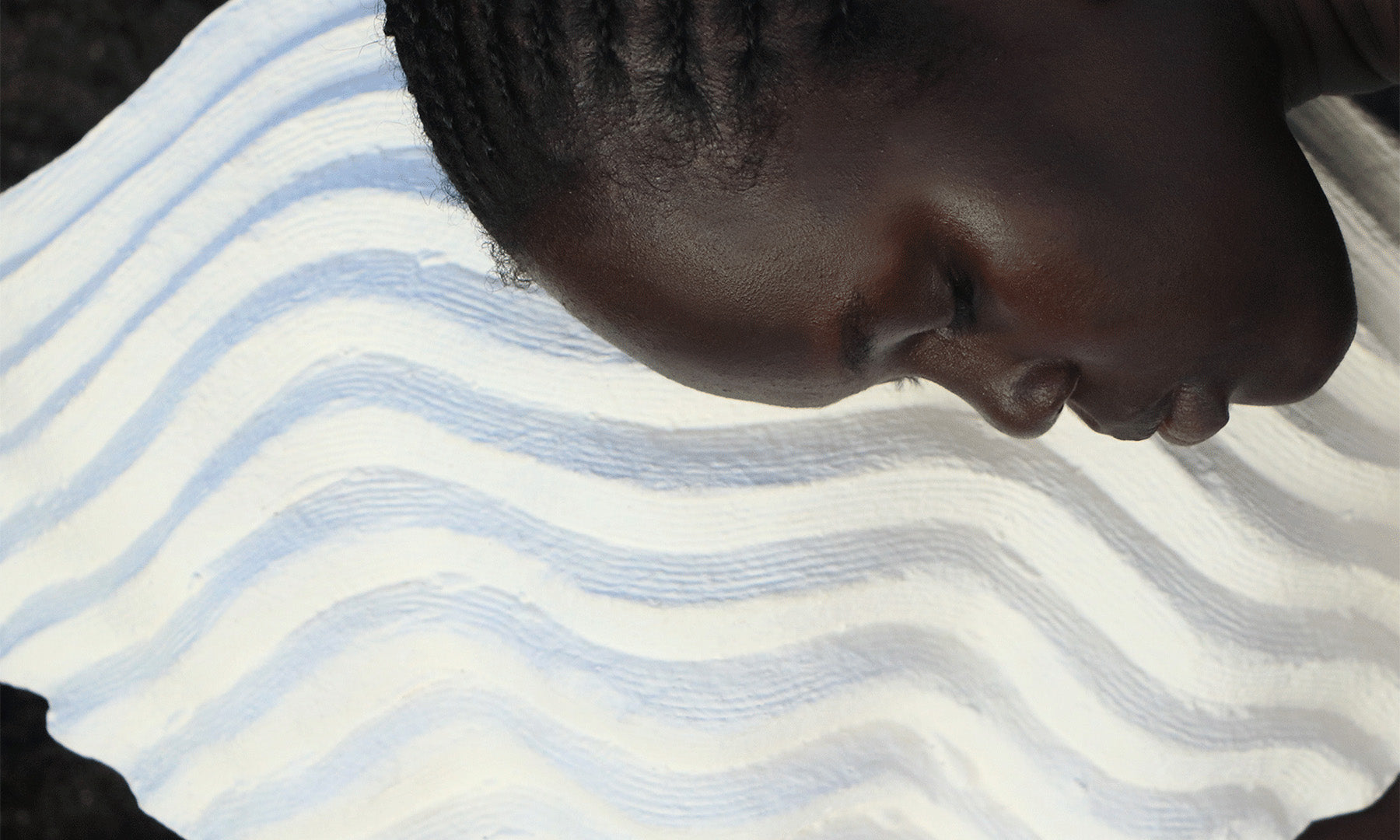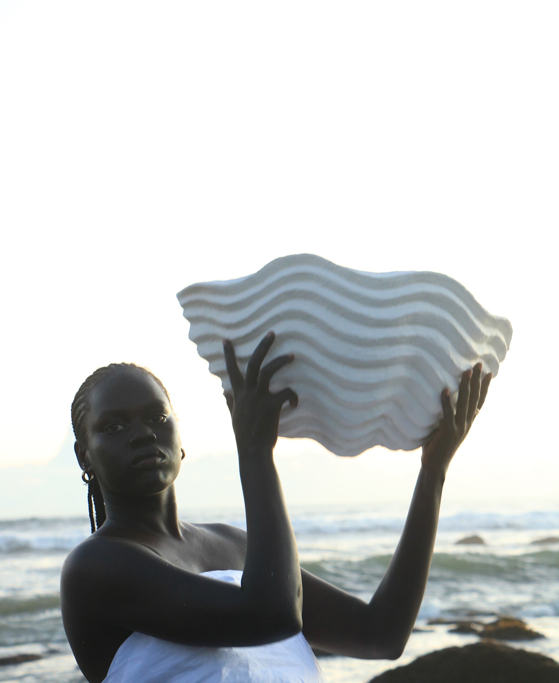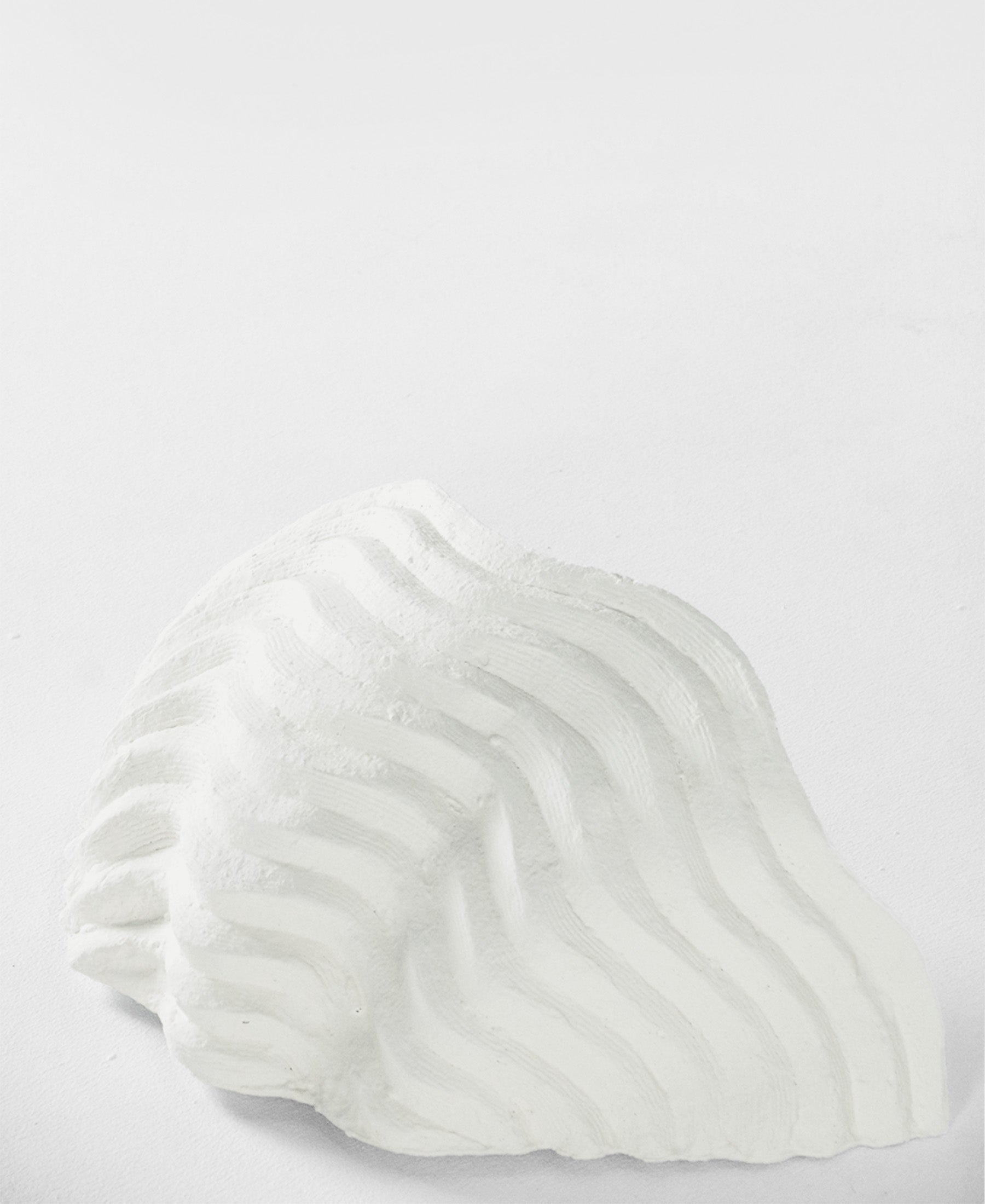 The resin mould is hand-sculpted to create a rippled surface that ascends from the base to the brim. To achieve the off-white colouring, a polymer plaster finish is applied – hand-brushed onto the mould, then massaged with up to four coats per piece. Subject to the individual movements of the maker’s hands, each is celebrated for its inconsistent brushstrokes and the unique craft.