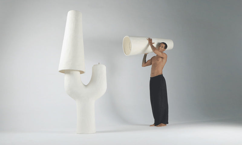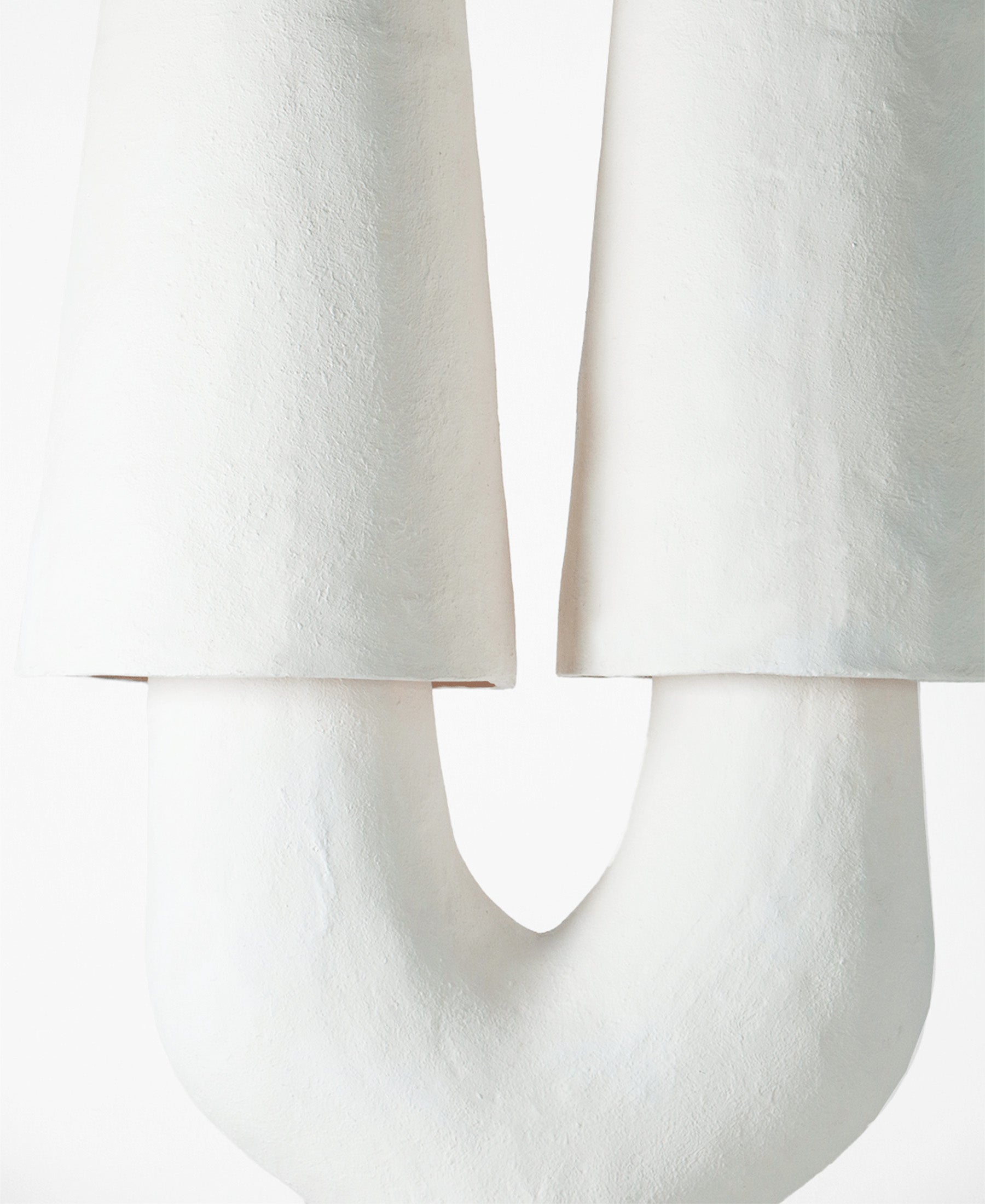 The hand-sculpted resin mould ensures the desired asymmetrical, slightly abstract object. To achieve the off-white colouring, a polymer plaster finish is applied – hand-brushed onto the mould with up to four coats per piece. Thick bristles add a grainy texture to the surface. This lamp is part of the Joshua Collection, designed to pair with either the standing or table lamps.
