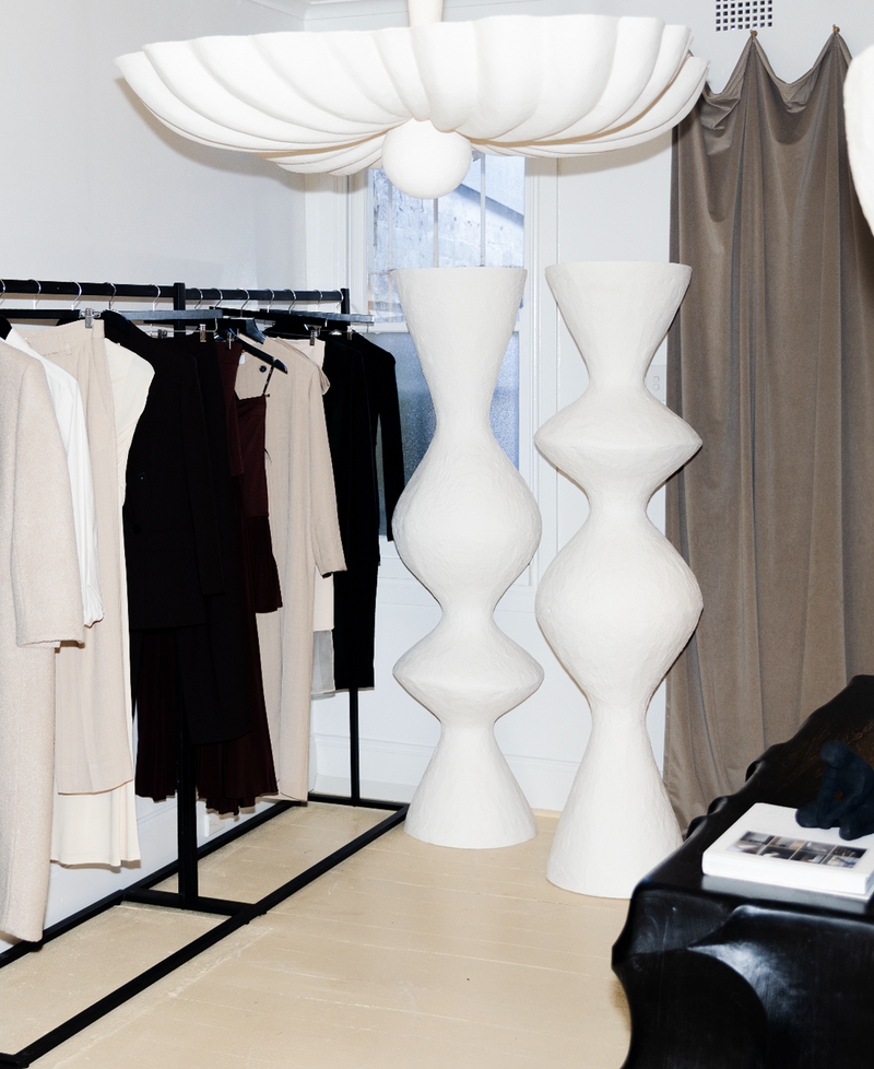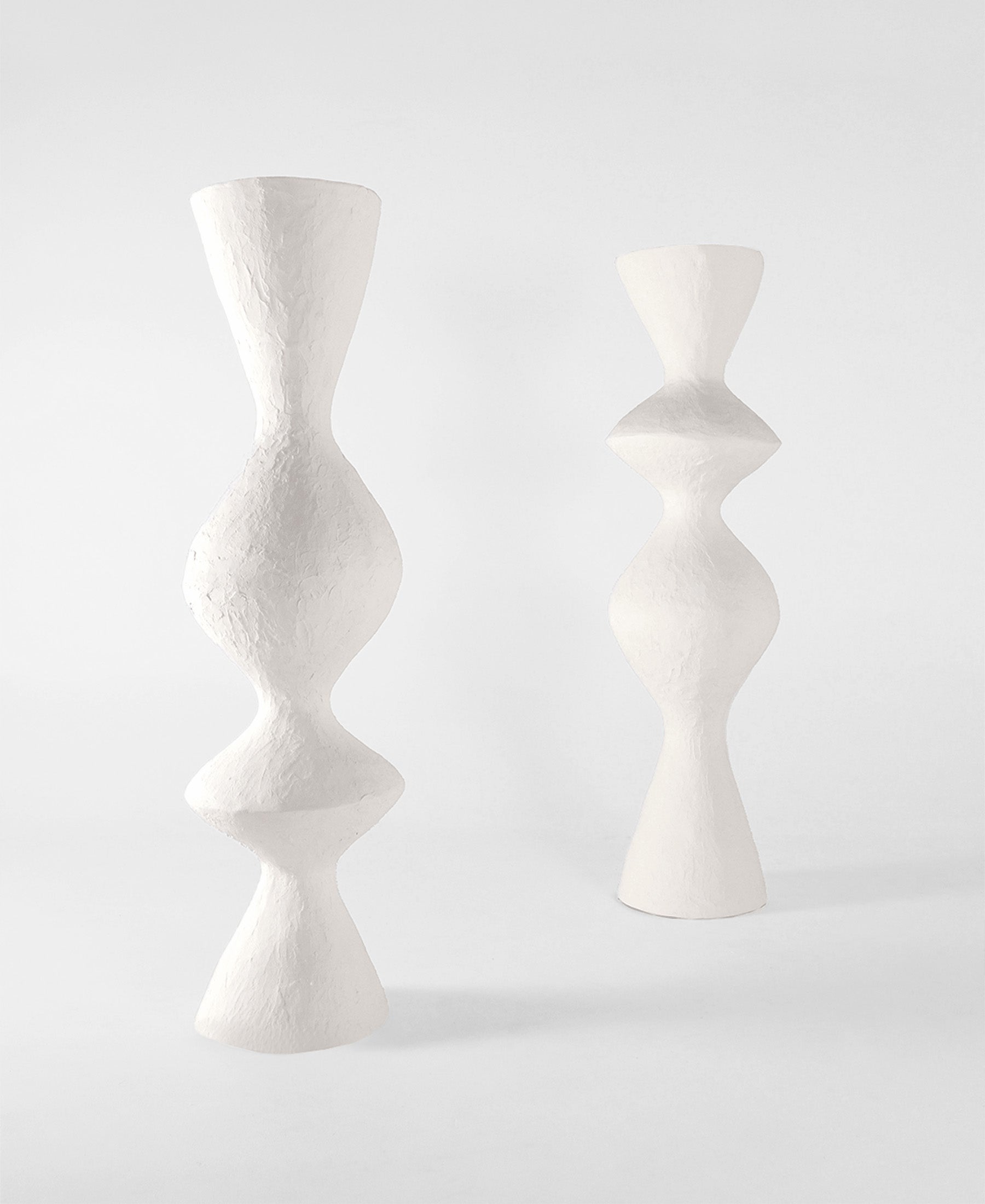 Hand-sculpted, intended for the asymmetrical and slightly abstract appearance. A polymer plaster is hand-brushed onto the mould, and massaged to create a thick off-white textured surface – up to four coats on every piece. Designed to stand on either end, the top and base are consistent, allowing you to choose the preferred orientation.