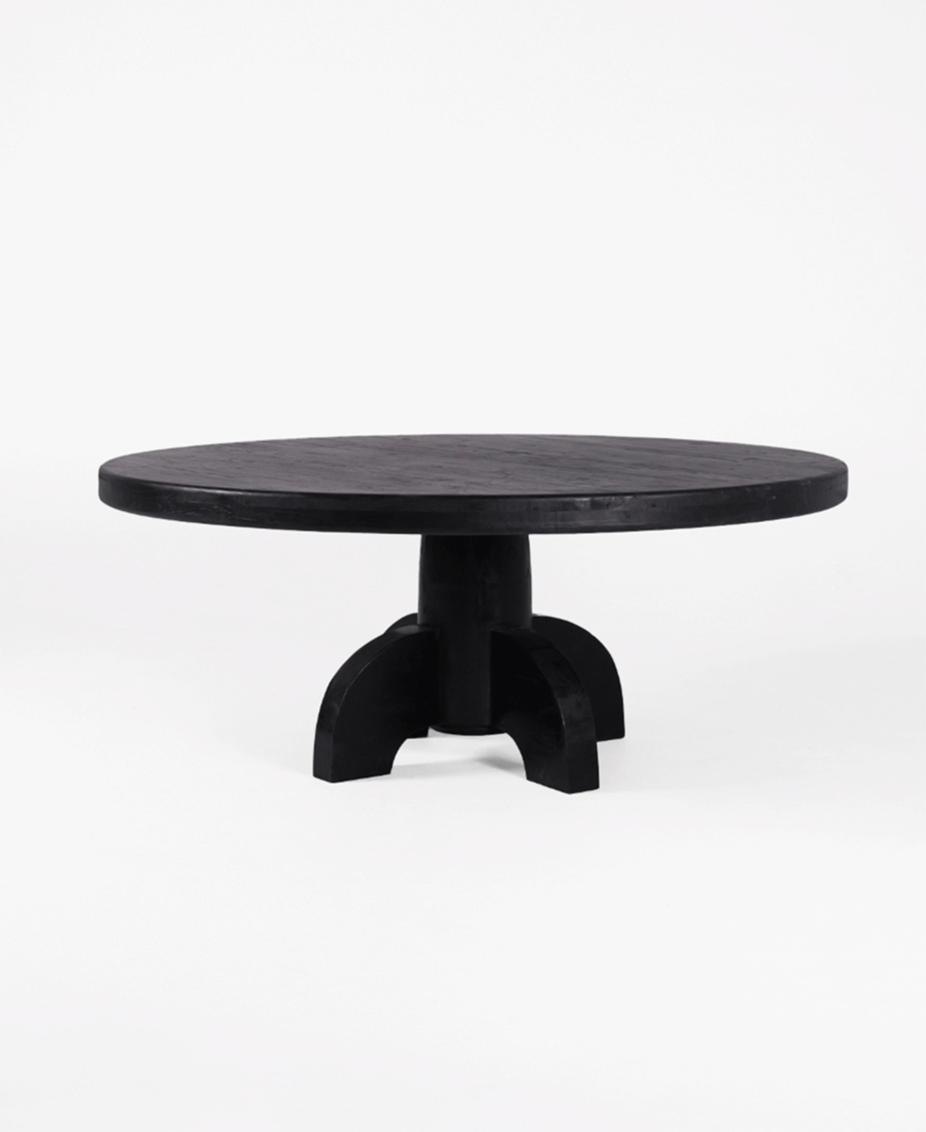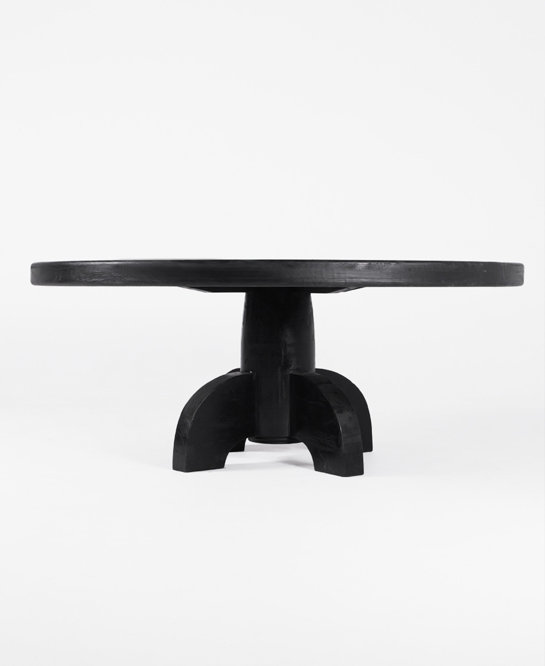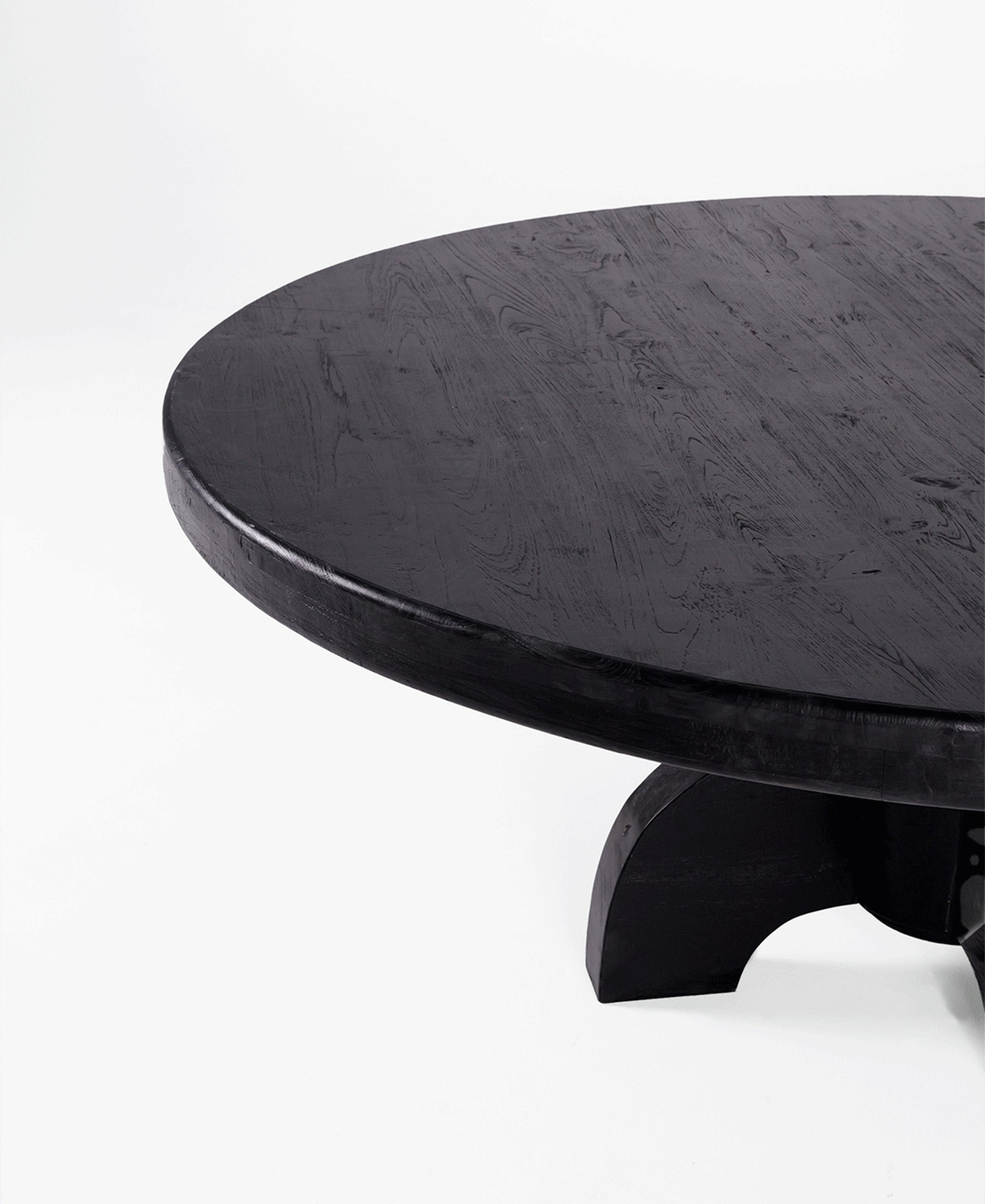 Made from 50-year-old teak, each plank is kiln-dried for seven days, then cooled for two. Planks are assembled, manually sanded, and edges rounded to expose the natural grain. The base has solid timber legs, machine-cut and fixed to a central column. Both tabletop and base are finished with semi-lustrous black lacquer for a quietly luxurious feel. Weighing over 100kgs, this piece is handcrafted over ten weeks by one woodworker, forming a sturdy dining focal point. Pair with the Primitive Chair.