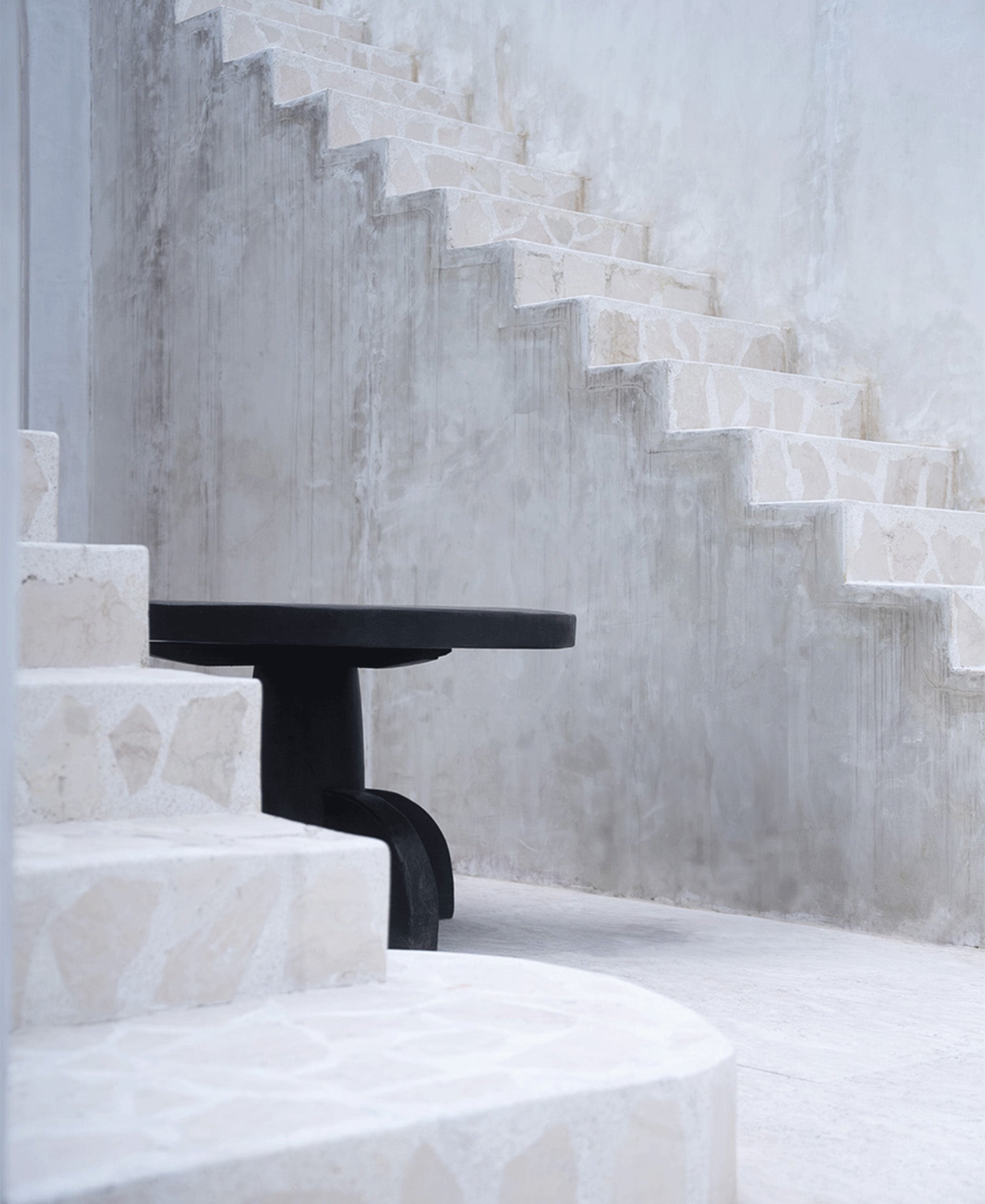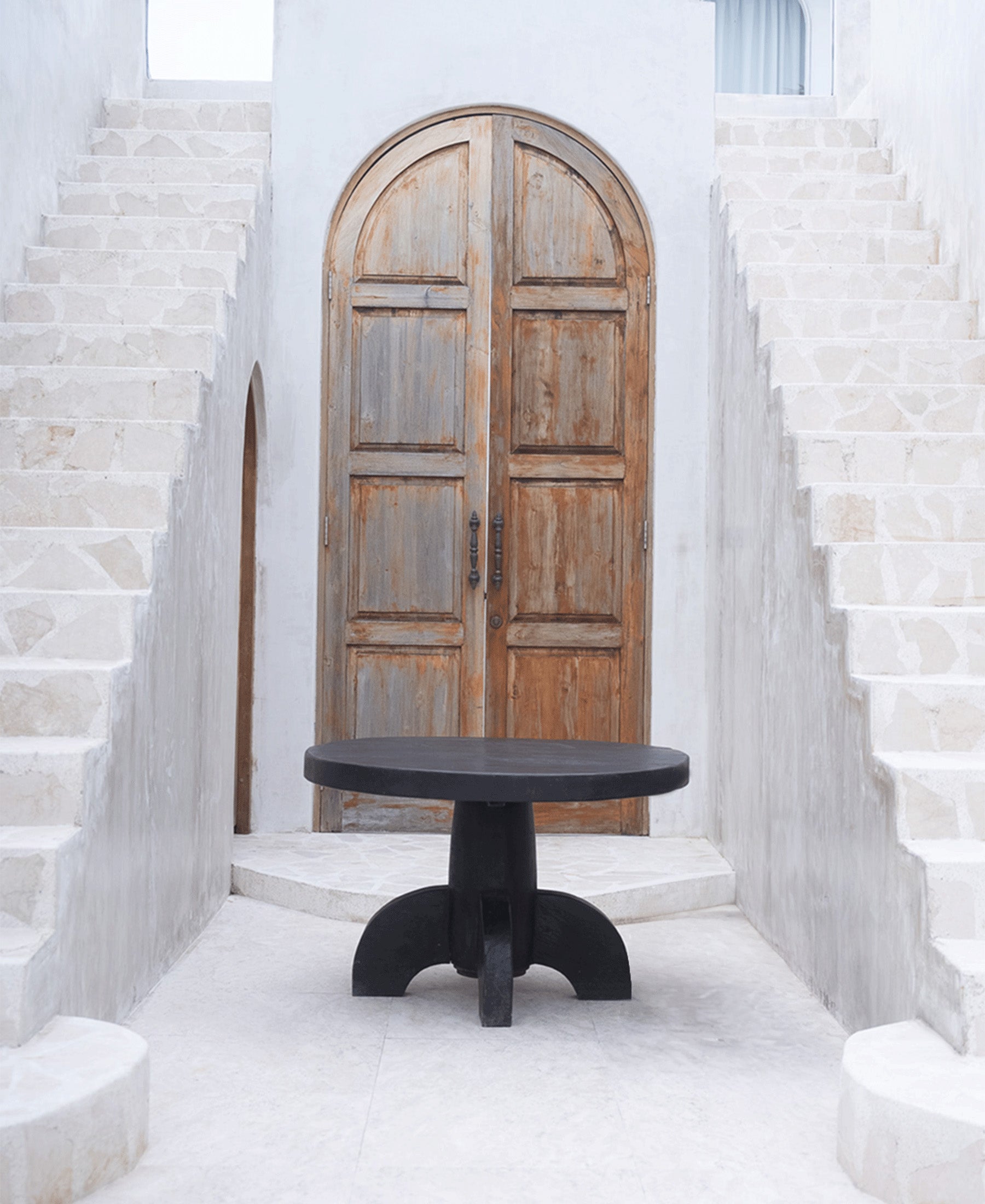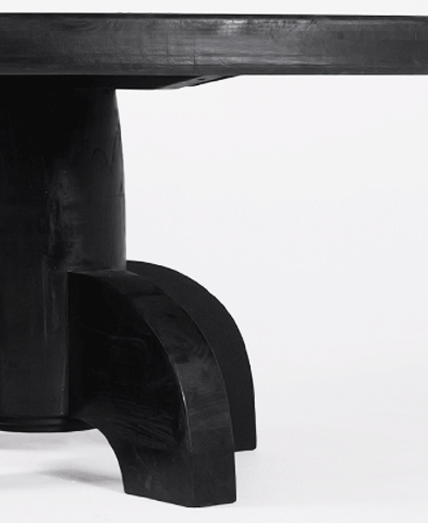Made from 50-year-old teak, each plank is kiln-dried for seven days, then cooled for two. Planks are assembled, manually sanded, and edges rounded to expose the natural grain. The base has solid timber legs, machine-cut and fixed to a central column. Both tabletop and base are finished with semi-lustrous black lacquer for a quietly luxurious feel. Weighing over 100kgs, this piece is handcrafted over ten weeks by one woodworker, forming a sturdy dining focal point. Pair with the Primitive Chair.