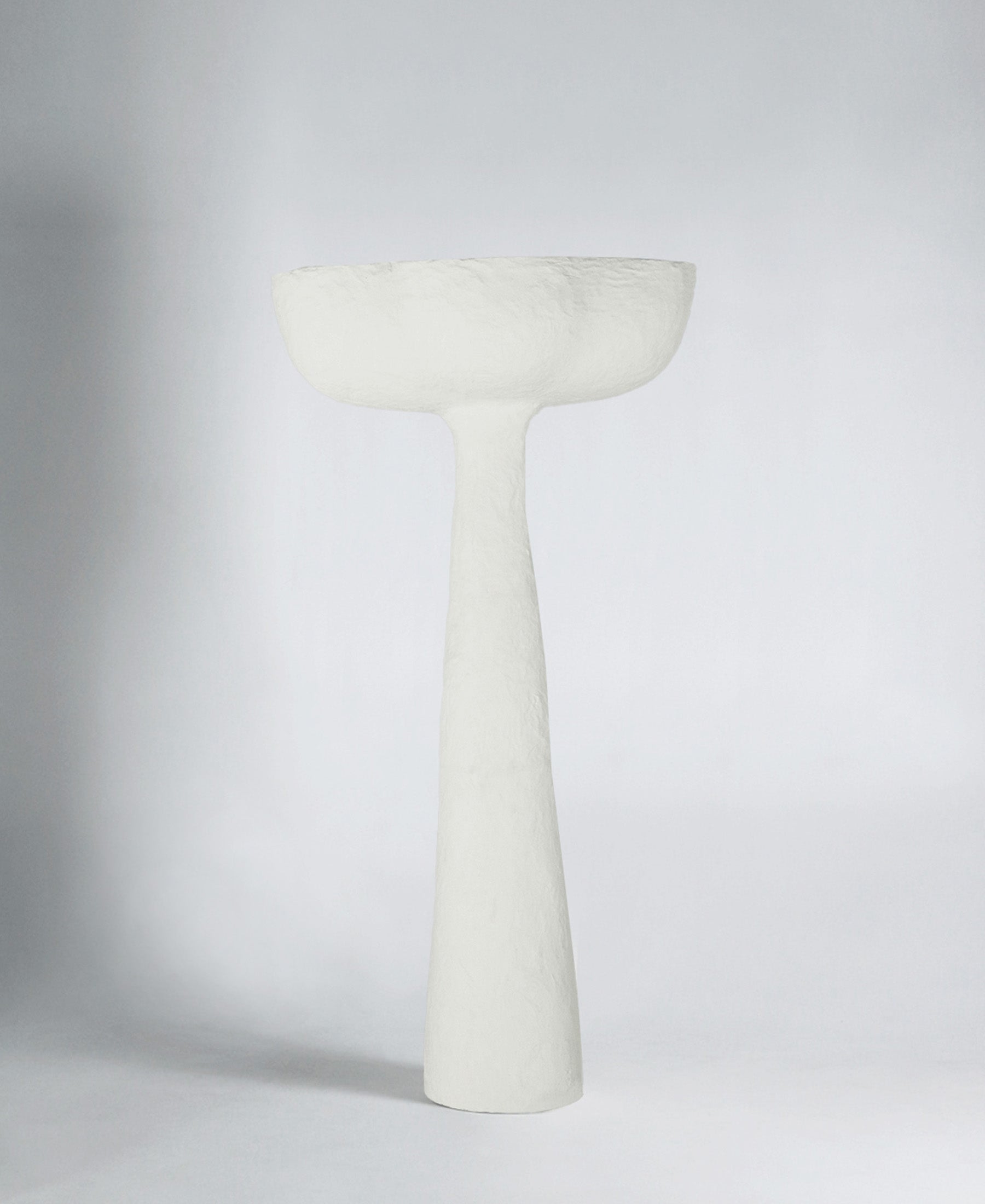 The resin mould is hand-sculpted, forming an asymmetrical and slightly abstract appearance. Applied with up to four coats of a polymer plaster finish, the piece holds a striking off-white colouring that is textural and inviting – a thick surface that is massaged by hand. A statement piece in the Luna collection, pair this with the companion wall light.