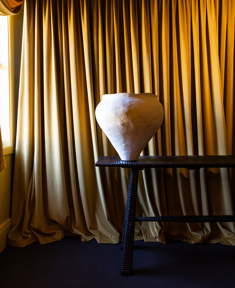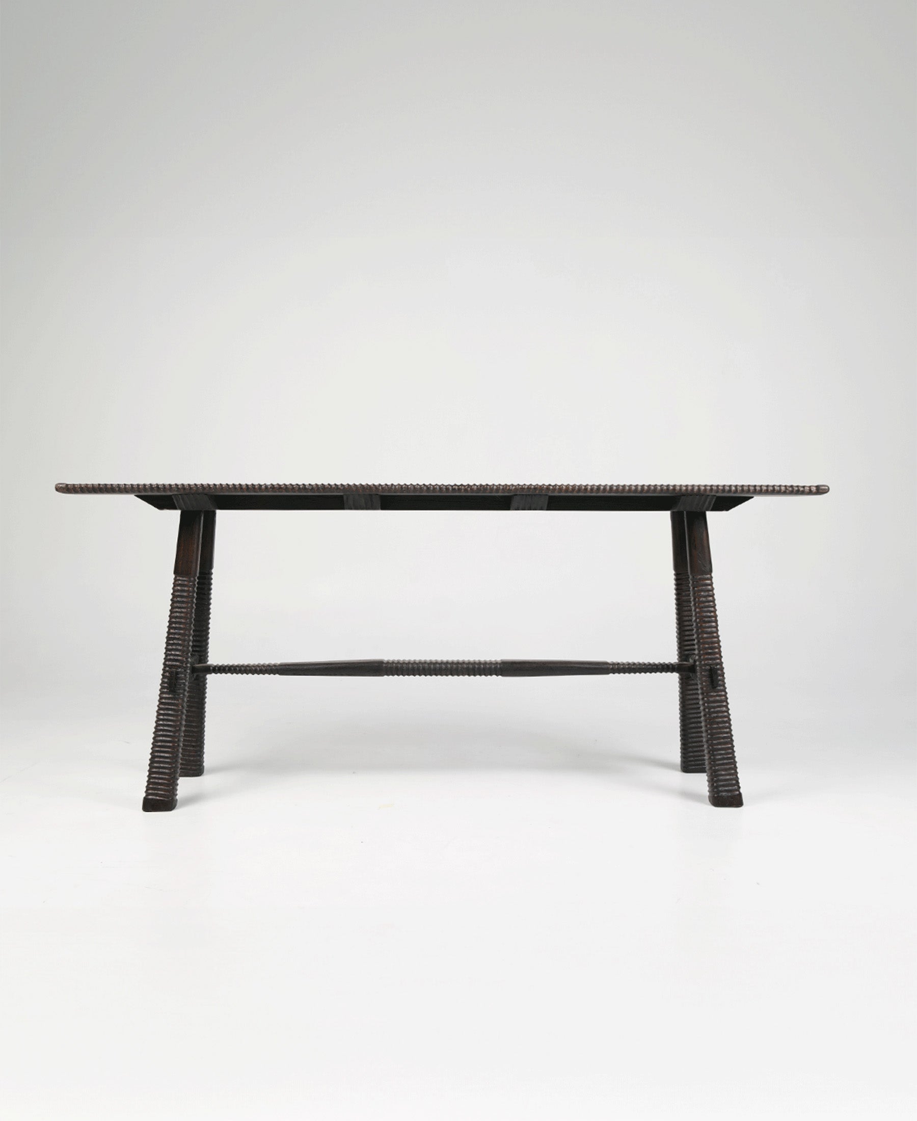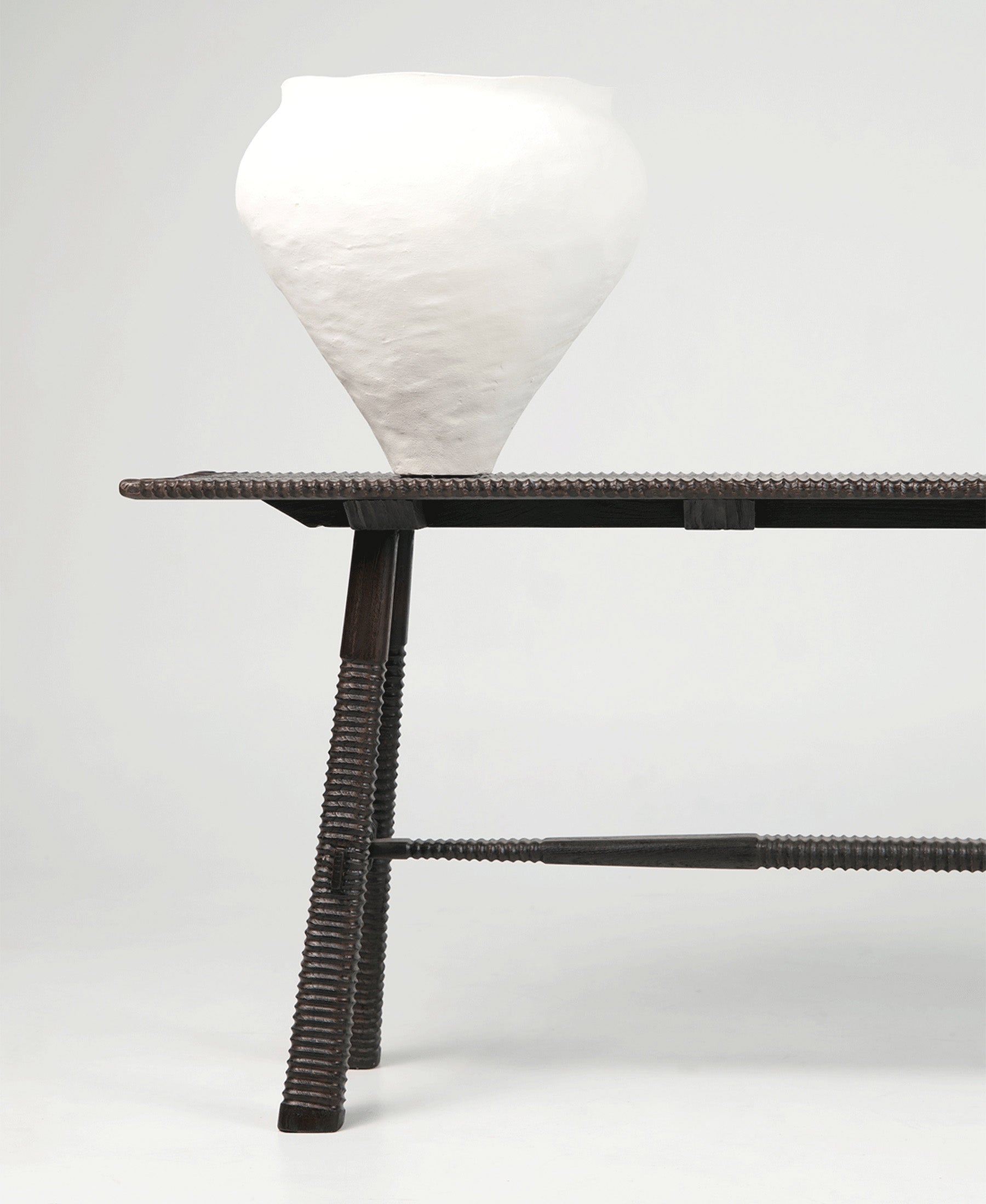 Timber is collected from 100-year-old logs, then cut into planks and kiln-dried for seven days to reduce the moisture content. After another two days of cooling, the planks are assembled into boards and chiselled around the perimeter, carving deep grooves along the table’s edge and centre. The surface is equally etched, then sanded back to expose the natural woody grain and highlight the beauty of the material. A process of sanding and staining is repeated up to four times to create a layered finish. The sole responsibility of a single woodworker, this piece is crafted over the course of 12 weeks and is intended to pair with the Maui Coffee Table and Maui Mirror.
