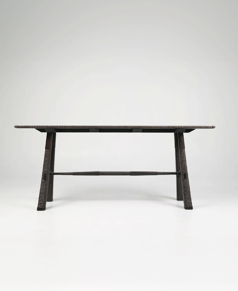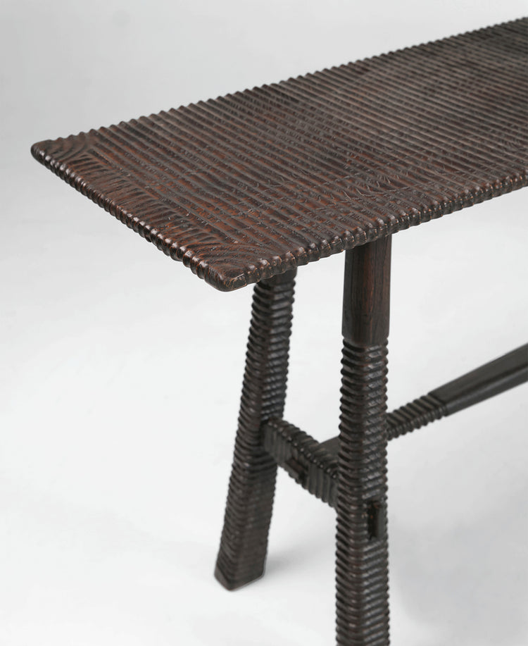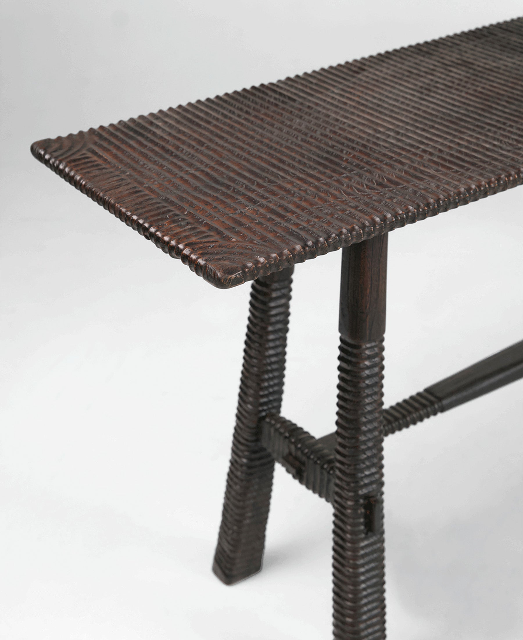 Imbued with the maker’s skilled touch, this console table features a fully rippled top, a surface alive with undulating contours that invite both conversation and thought. Crafted from century-old timber, gather around a piece of history and share stories. This is where traditions continue and evolve.
