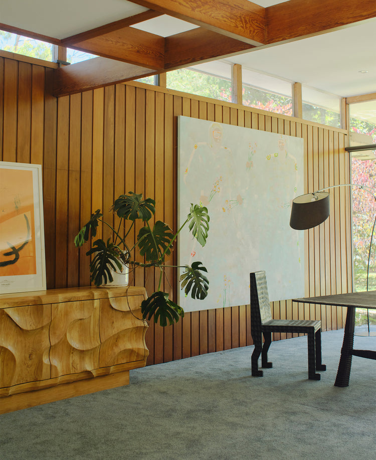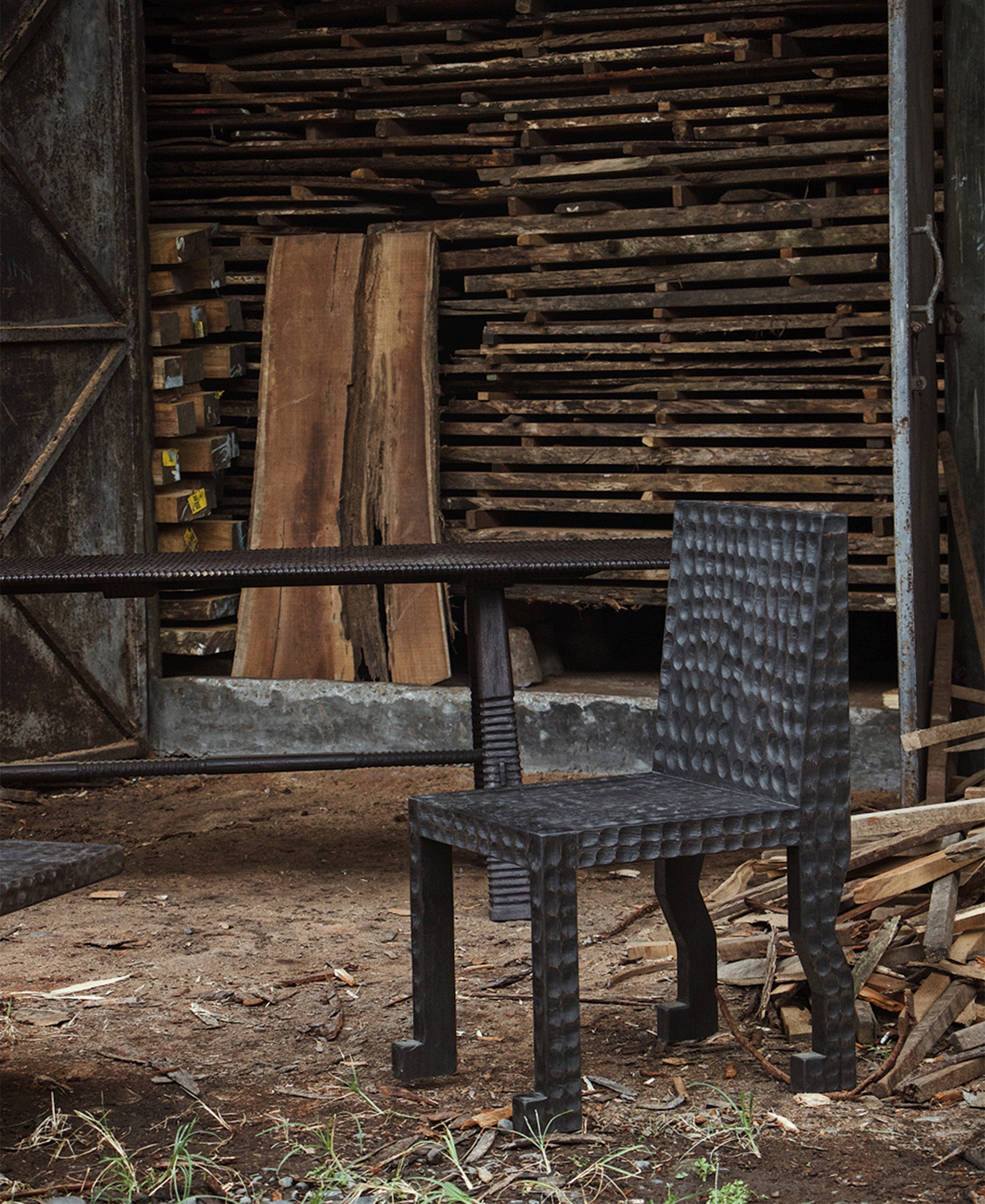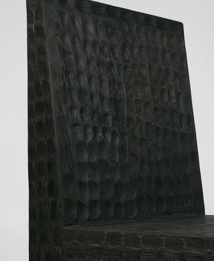 Harvested from a century-old log, the timber is run through a 1950s saw machine and cut into planks. After drying for seven days in the kiln to reduce moisture content, the oven doors are opened and left to cool for another two days. Planks are then assembled into boards before being manually carved using a traditional chisel – a passed-down technique of chipping away at the timber from different angles, creating dimples in the wood. Cultivated by a single set of hands, consistently and with precision, each divet is repeatedly sanded and stained to ensure the colour is fully absorbed into the timber grain. Designed to pair with the Maui Dining Table as part of the Maui Collection.