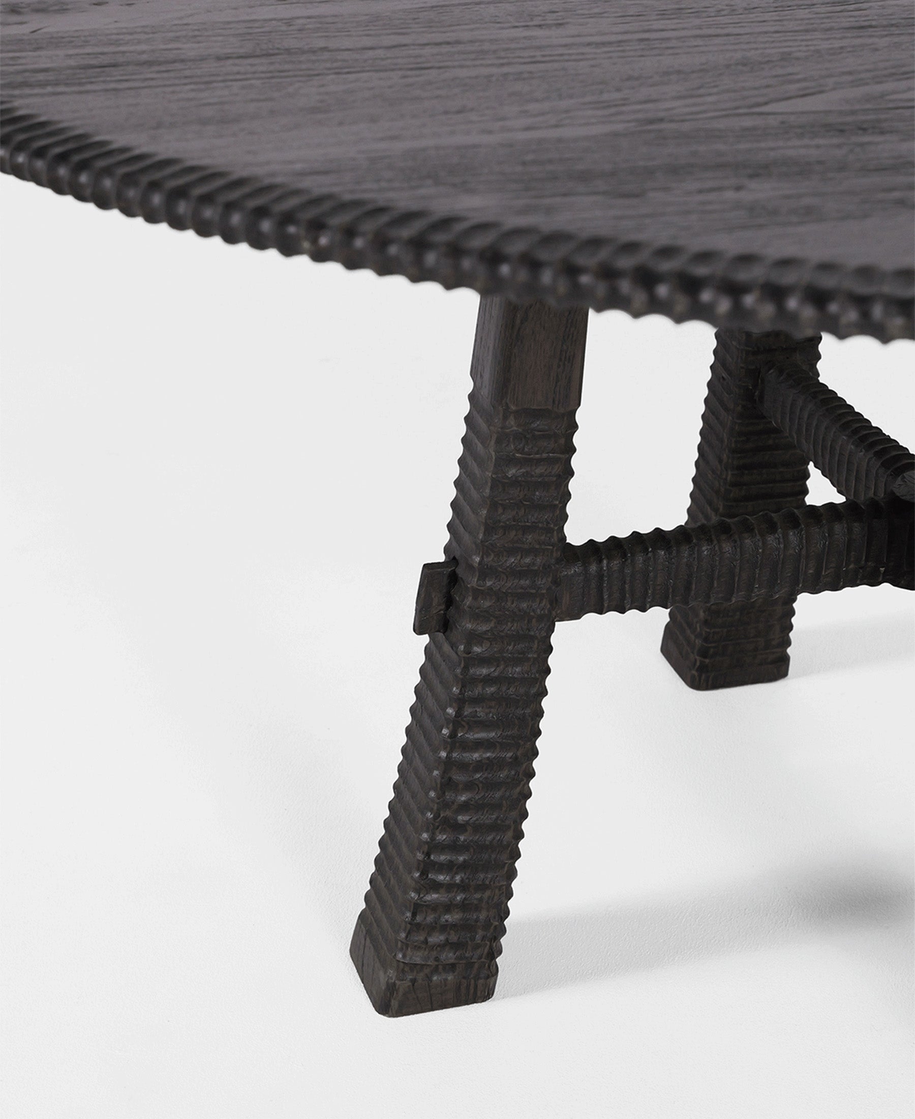 Timber is collected from 100-year-old logs, then cut into planks and kiln-dried for seven days to reduce the moisture content. After another two days of cooling, the planks are assembled into boards and chiselled around the perimeter, carving deep grooves along the table’s edge. The surface of the table’s centre remains smooth, sanded back to expose the natural woody grain and highlight the beauty of the material. A process of sanding and staining is repeated up to four times to create a layered finish. The sole responsibility of a single woodworker, this piece is crafted over the course of 12 weeks and is intended to pair with the Maui Coffee Table and Maui Mirror.