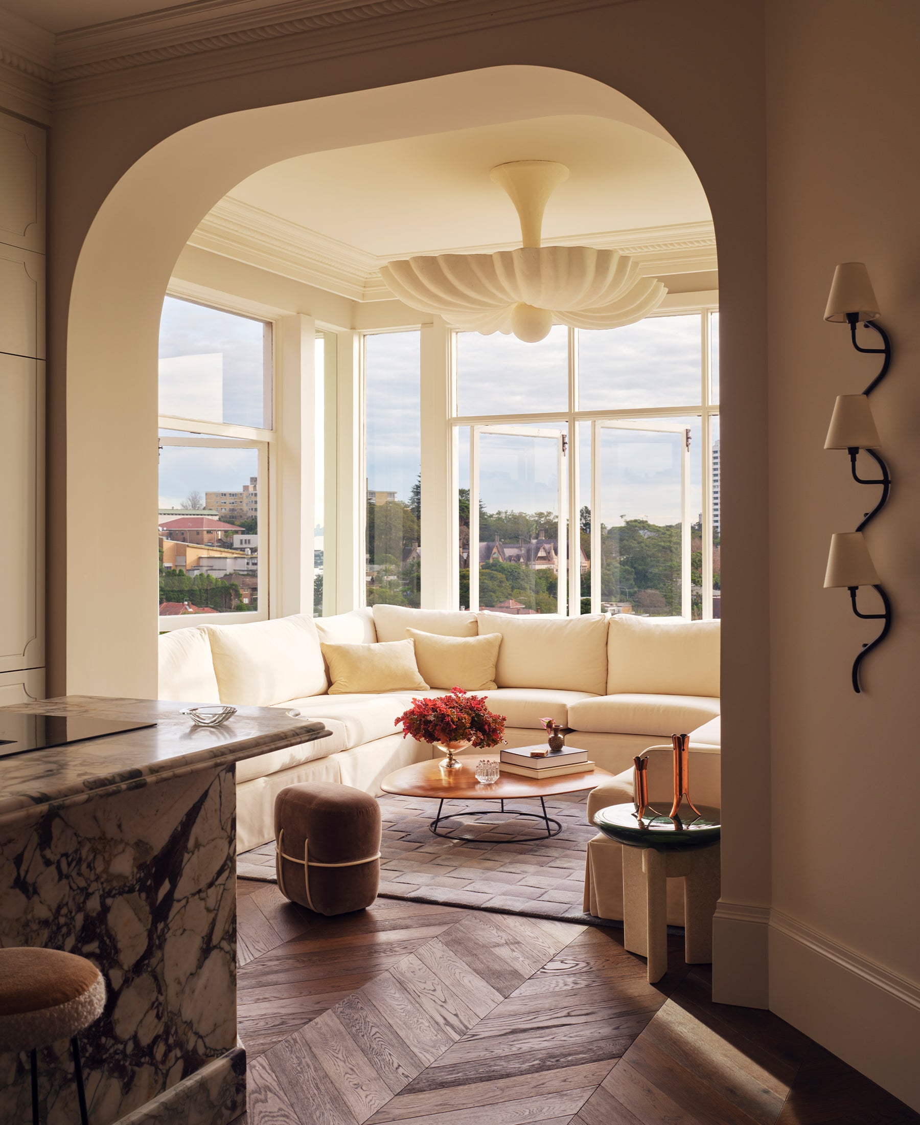 The hand-sculpted resin mould draws on inspiration from classical floral forms. A polymer plaster finish is utilised to achieve the distinct off-white colouring, applied by hand as it is brushed and massaged onto the mould. The result is a textured surface that flows over the fluid curves of the piece.