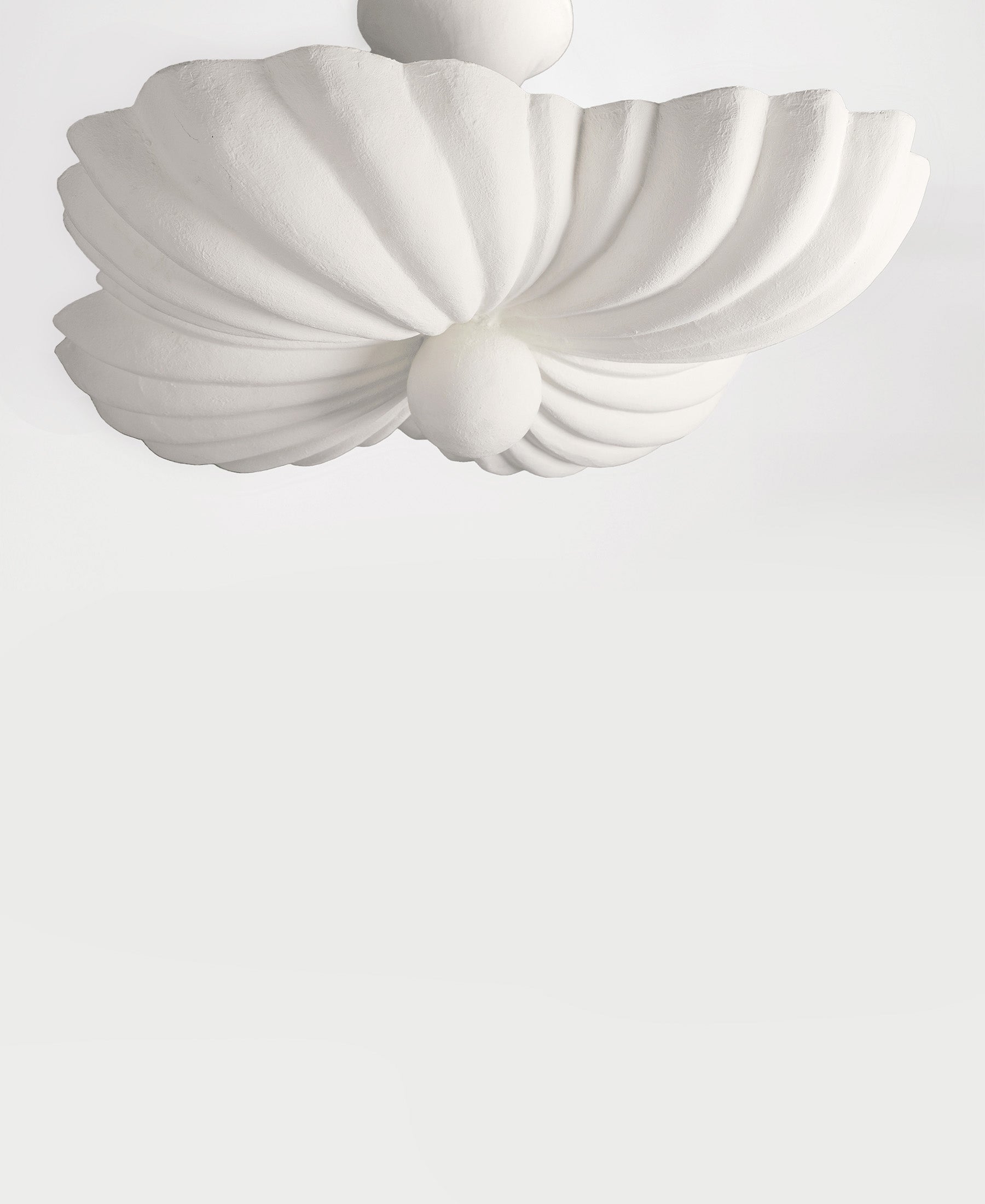 Sculptural lighting that merges the high and low, a centrepiece that teeters on flamboyant. The floral shape is hand-moulded, then painted by artisans, merging cultures and stories with the raw-edged, natural world.