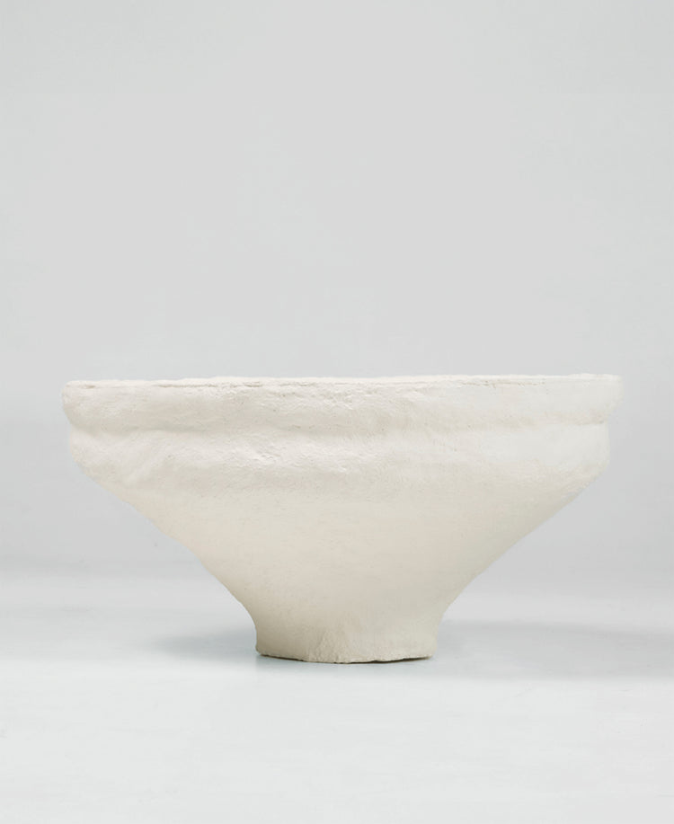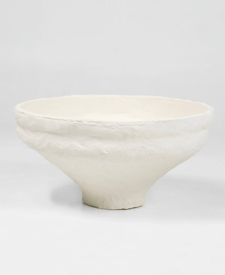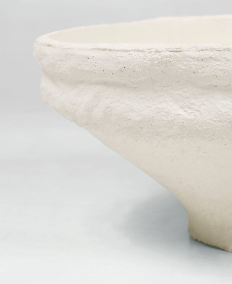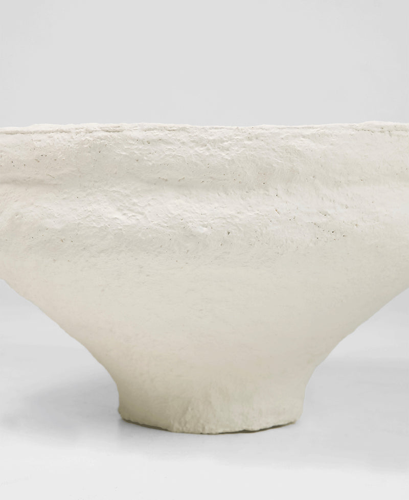 Cast from hand-pressed concrete, the bowl is applied with a plaster finish to all sides. Irregular brushstrokes and a dabbing technique add textural depth to the piece, while the off-white colouring aids in exaggerating the sheer scale.