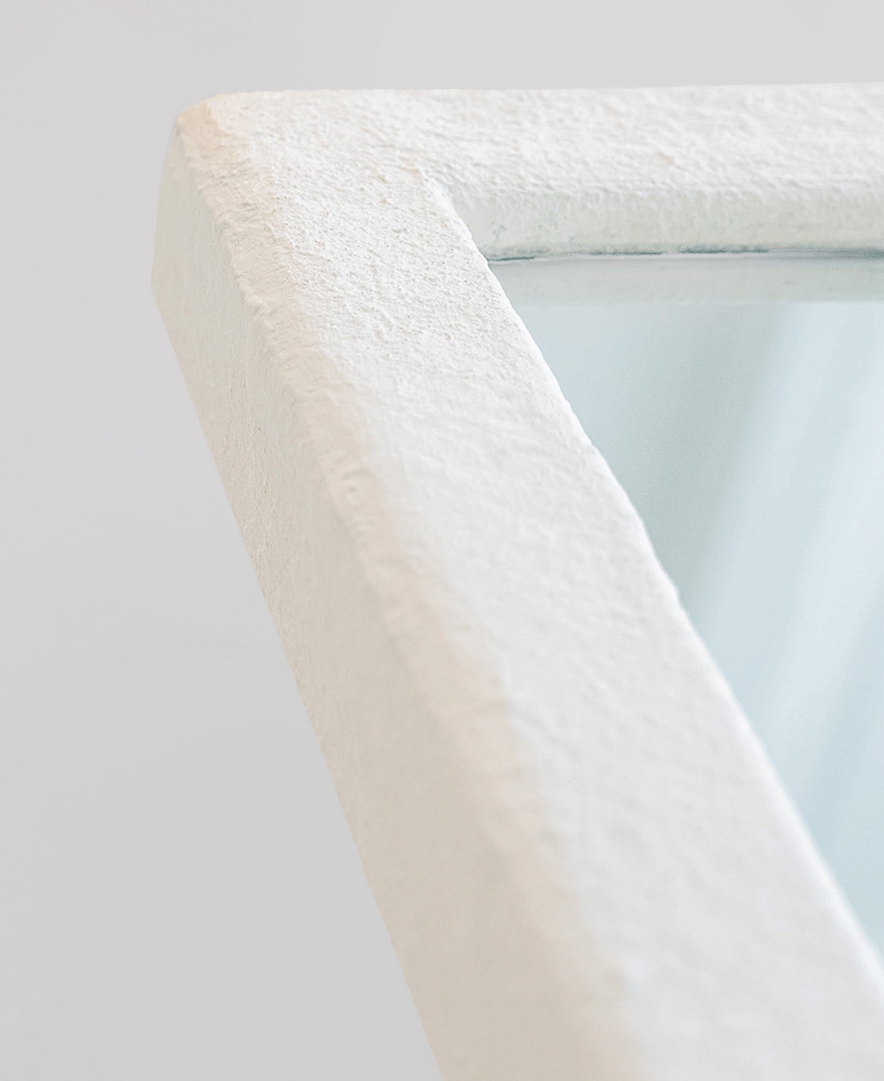 With a resin mould base, a polymer plaster is then applied in layers. Irregular brushstrokes are used, ensuring the off-white plaster finish is textural and visible on all exposed sides. After each coat, the plaster is cured by fan-drying, repeated up to three times to achieve the desired depth and strengthen the surface finish.