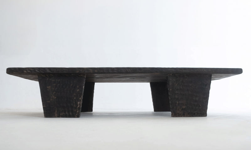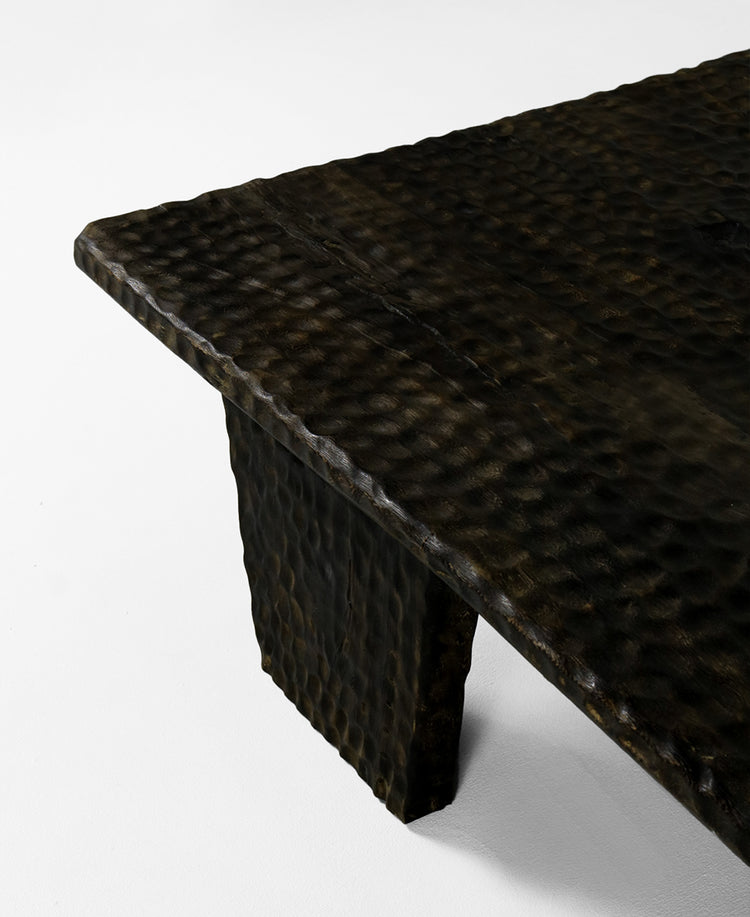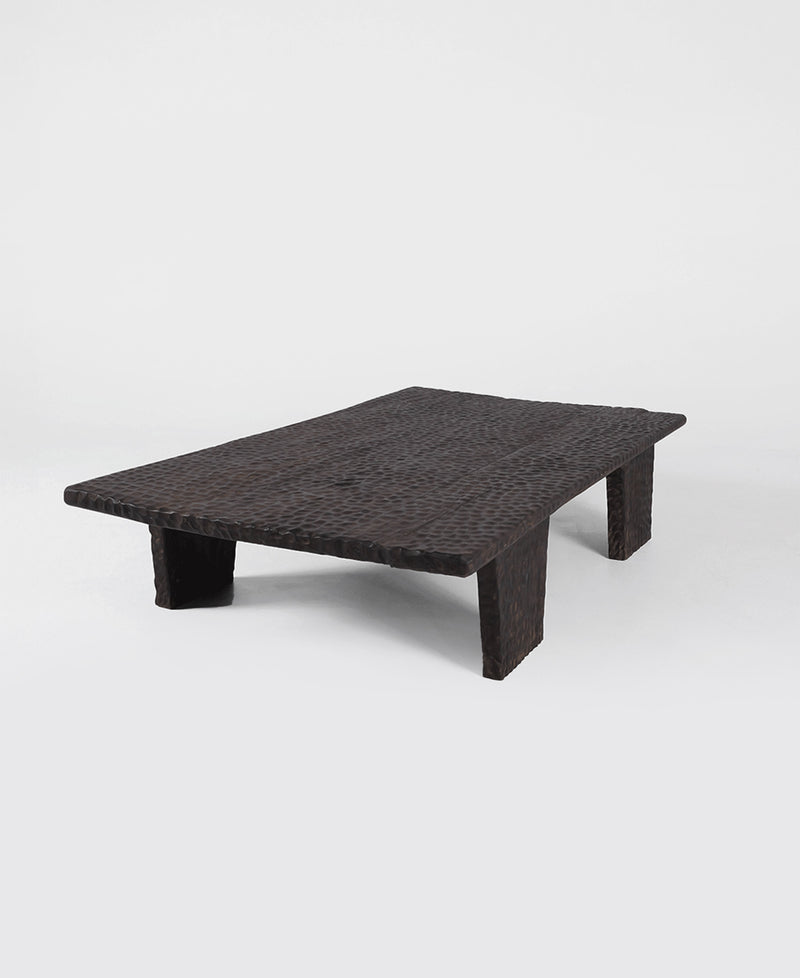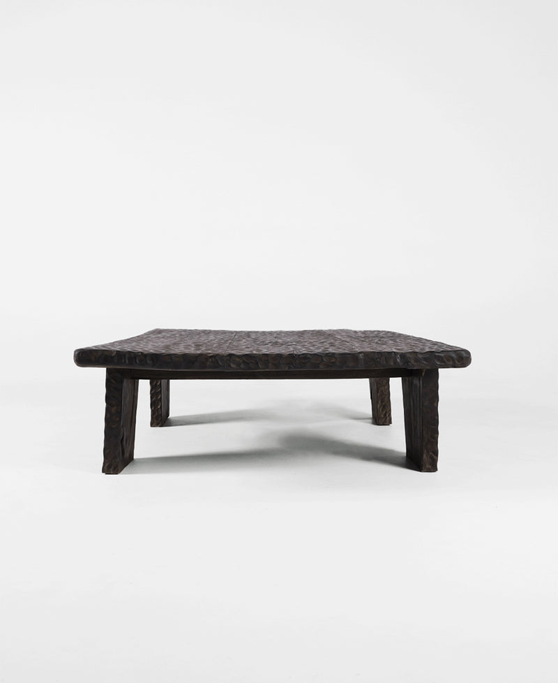 A coffee table with each groove skillfully chipped by artisans over six weeks, revealing an unseen indentation with every glance. The hammered surface for creative expression on display, carved to continue the narrative.